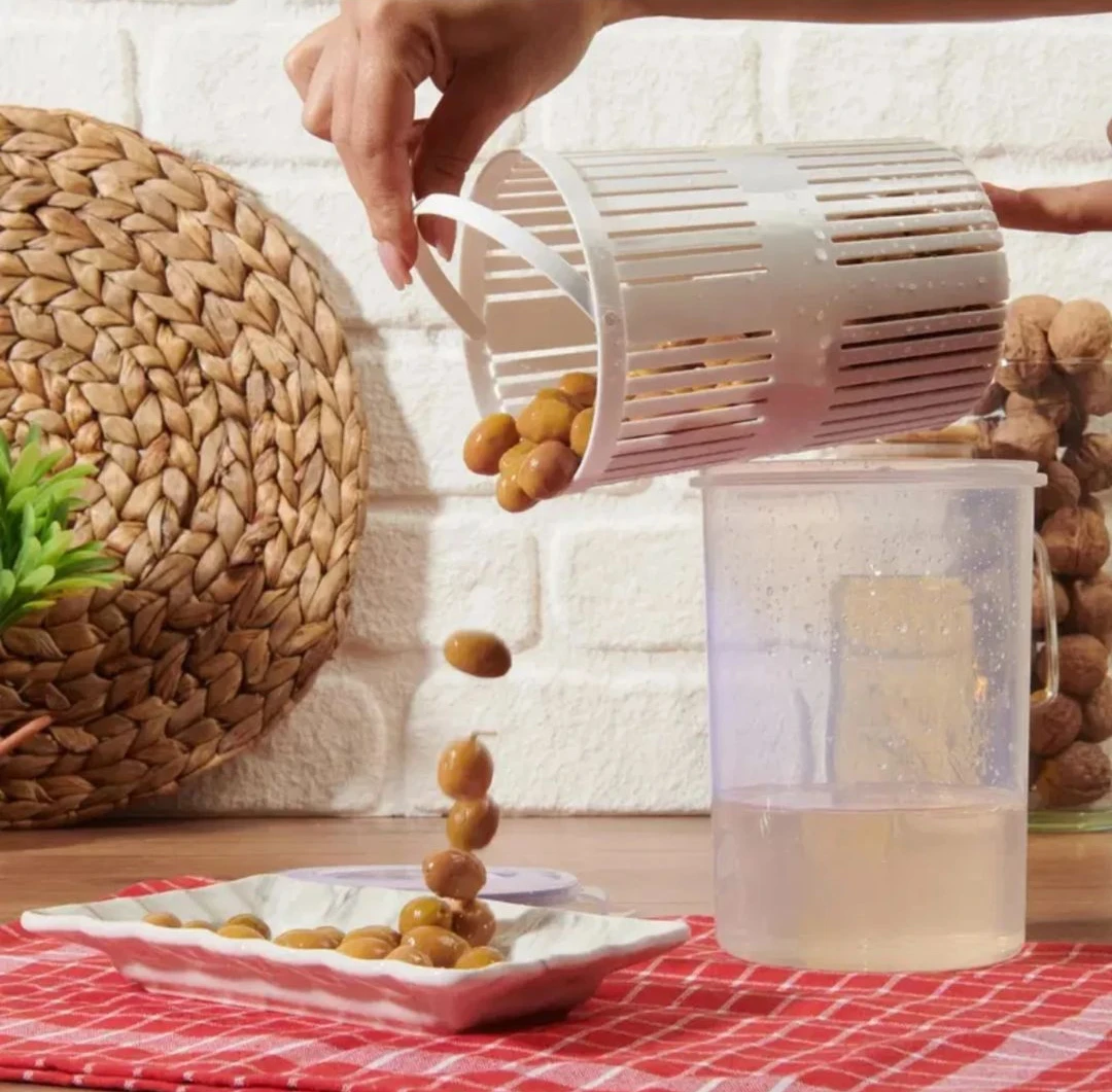 Praktik Süzgəc Sistemi: Daxili süzgəc sayəsində zeytun və ya turşuları götürərkən suyu qabın dibində qalır, bu da həm gigiyena, həm də istifadə rahatlığı yaradır.