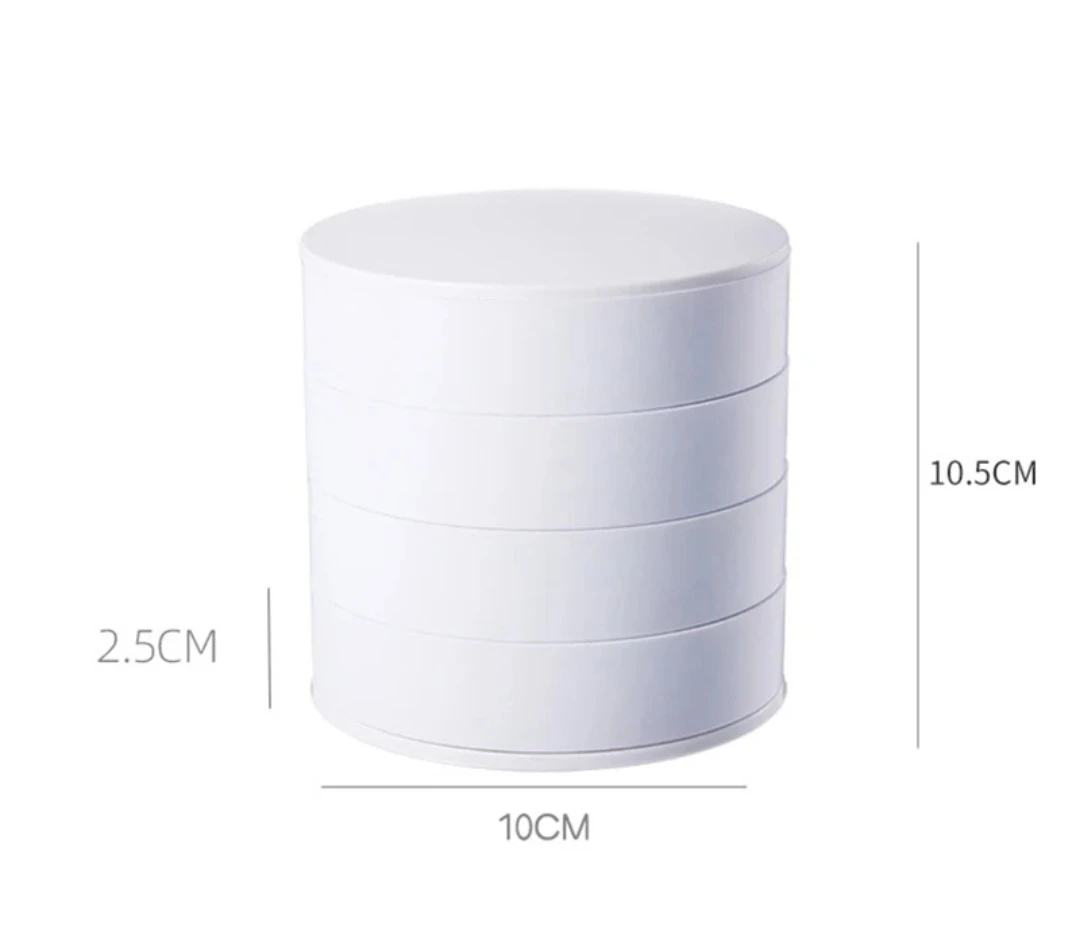 Kiçik aksesuarlarınızı itməkdən qoruyun və masanızın üzərində estetik nizam yaradın! Bu 4 bölməli halqalı orqanayzer, xüsusi fırlanan mexanizmi ilə hər bir mərtəbəyə asan çıxış təmin edir və az yer tutaraq maksimum saxlama sahəsi yaradır.