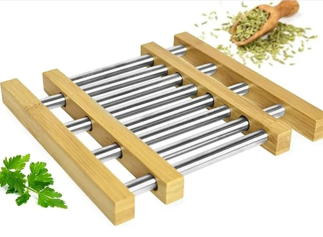 Sürüşməz və Sabit: Alt hissədəki bambuk teksturası səthlərə möhkəm yapışır, metal karkas isə qabın ağırlığını bərabər bölərək sabitlik yaradır.