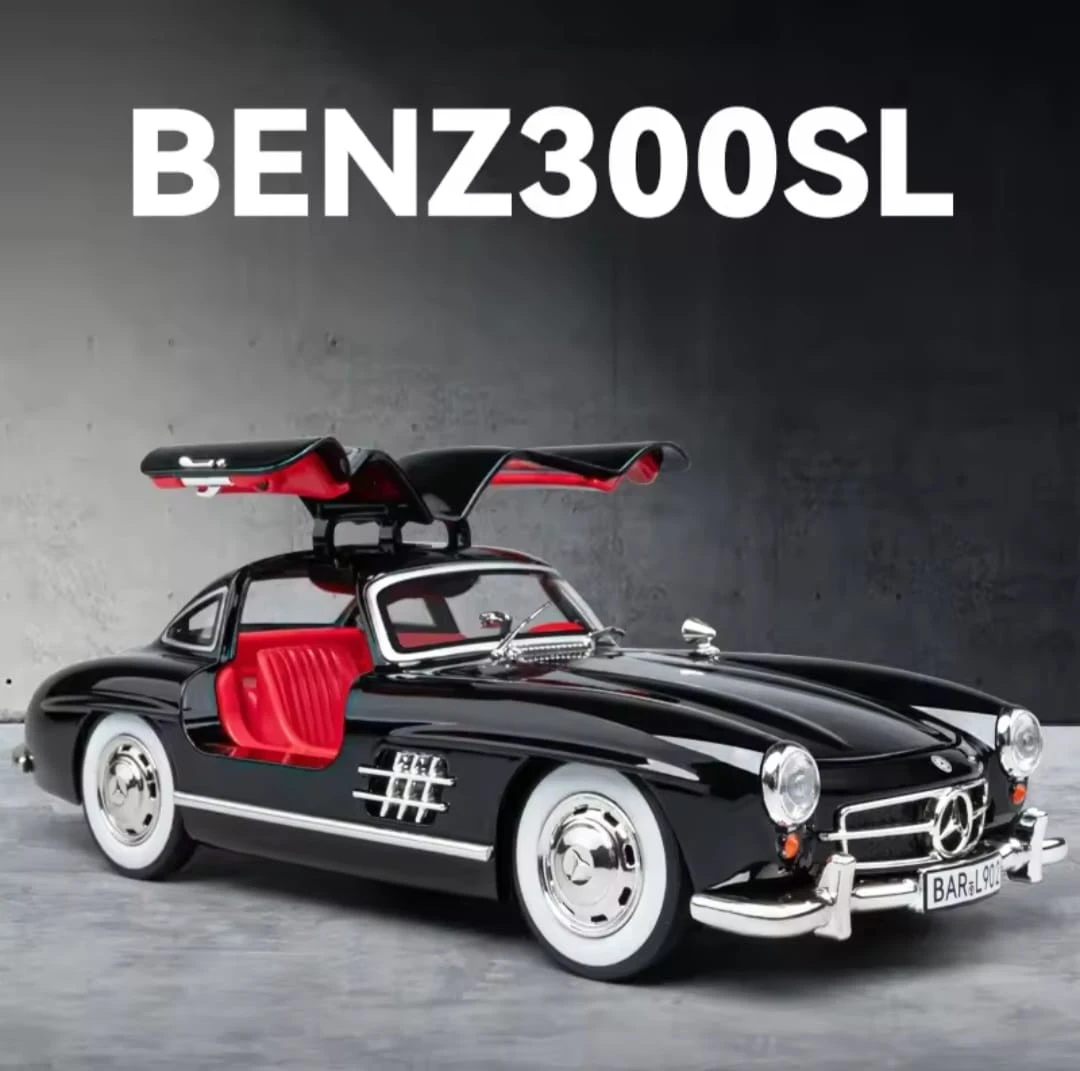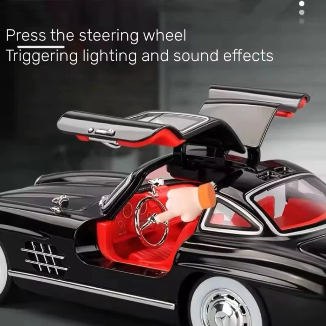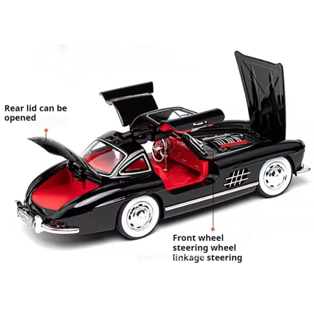 1:24 Mercedes Benz 300SL Klassik Vintage avtomobil Uşaq Oğlan Ad günü Hədiyyə Kolleksiyası. Qapıları və kapotları açılır və səsi və işıqları yanır. Uzunluğu 20 sm, eni 7.5 sm, hündürlüyü 4.5 sm, çəkisi - 320 qram. Materialı - Metal, kapron, rezin. Rəng - Qara, ağ və qırmızı salon.